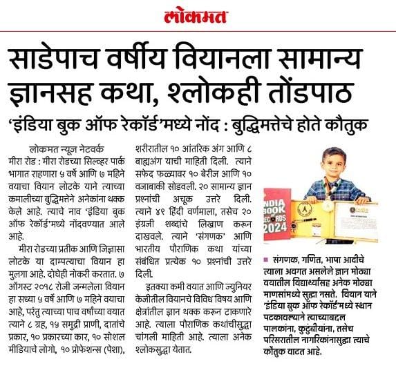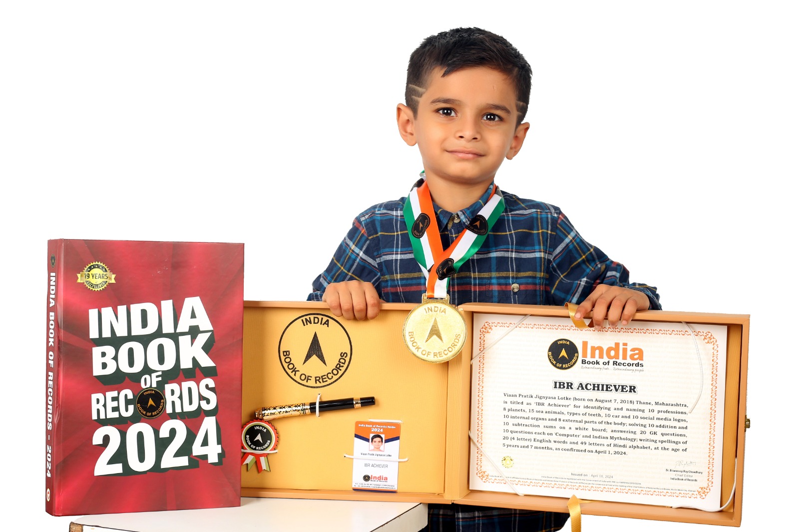 Viaan Pratik Jignyasa Lotke (born on August 7, 2018) Thane, Maharashtra, is titled as 'IBR Achiever' for identifying and naming 10 professions, 8 planets, 15 sea animals, types of teeth, 10 car and 10 social media logos, 10 internal organs and 8 external parts of the body; solving 10 addition and 10 subtraction sums on a white board; answering 20 GK questions, 10 questions each on 'Computer' and Indian Mythology; writing spellings of 20 (4 letter) English words and 49 letters of Hindi alphabet, at the age of 5 years and 7 months, as confirmed on April 1, 2024.