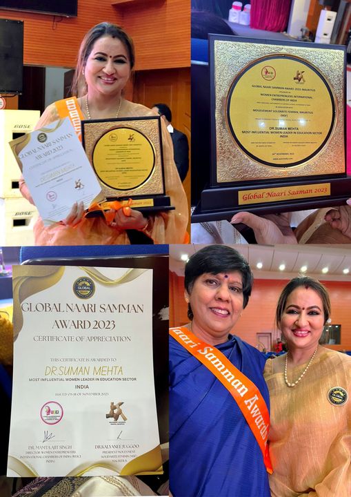 You can truly become accomplished at something you love…….. There are a few people who are phenomenal achievers and inspiration for others; whose world not just enlightens lives but also summons a person’s inner strength. The Seven Eleven Education Society takes immense pride to announce that Chairperson Dr Suman Mehta has been conferred with - Global Nari Samman Award 2023 - Mauritius organized by Women Entrepreneurs International Chambers of India (WEICI) with Ministry of Corporate Affairs, Government of India in association with Mouvement Solidarite Feminin (MSF), Mauritius on November 18, 2023, for her outstanding contribution and milestone achievement as the most influential women leader in education sector, India. The esteemed guests included - Leela Devi Dookun Luchoomun (Vice Prime Minister and Minister of Education, Mauritius), Dr Kalyanee Jugoo (President of MSF) and Dr Mamta Ajit Singh (Director of WEICI). Having an eminent personality the chairperson has worked on the philosophy to inculcate education and values in young minds who all are rooted in the love of learning. Her service in the field of education manifested values and created a platform of excellence.